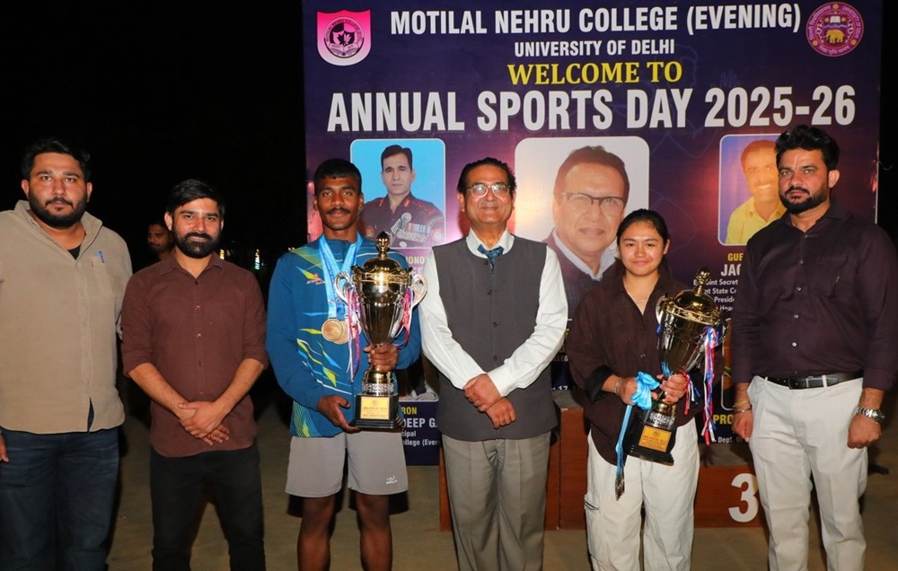 मोतीलाल नेहरू कॉलेज (सांध्य) ने अपनी वार्षिक खेलकूद प्रतियोगिता 2025-26 का सफलतापूर्वक आयोजन किया। तीन दिवसीय आयोजन में शानदार प्रदर्शन करते हुए मानस कुमार (बी.ए. प्रोग्राम, प्रथम वर्ष) ने तीन प्रतियोगिताओं में प्रथम स्थान प्राप्त कर सर्वश्रेष्ठ एथलीट (पुरुष) का खिताब जीता। वहीं आहना बराल (बी.ए. प्रोग्राम, प्रथम वर्ष) ने चार प्रतियोगिताओं में प्रथम तथा एक में द्वितीय स्थान प्राप्त कर सर्वश्रेष्ठ एथलीट (महिला) का खिताब अपने नाम किया।